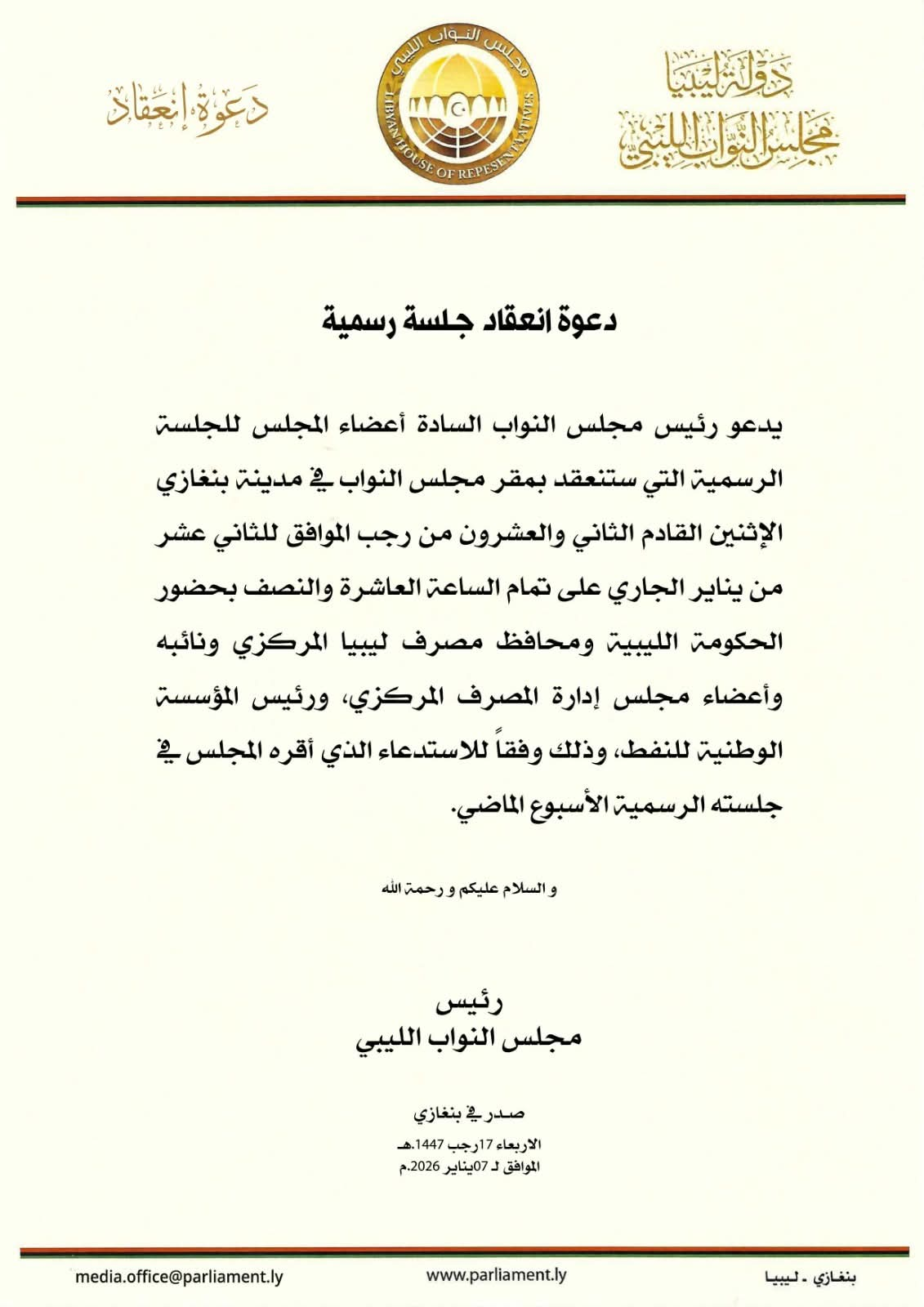 دعا رئيس مجلس النواب، المستشار عقيلة صالح، أعضاء المجلس إلى حضور جلسة رسمية تُعقد بمقر المجلس في بنغازي، وذلك يوم الإثنين المقبل للثاني عشر من يناير الجاري، عند تمام الساعة العاشرة والنصف صباحًا وأوضح المجلس، في دعوة رسمية صادرة عنه، أن الجلسة ستُعقد بحضور الحكومة الليبية، ومحافظ مصرف ليبيا المركزي ونائبه، إلى جانب أعضاء مجلس إدارة المصرف المركزي، ورئيس المؤسسة الوطنية للنفط وأشار البيان إلى أن هذه الجلسة تأتي تنفيذًا للاستدعاء الذي أقره المجلس خلال جلسته الرسمية المنعقدة الأسبوع الماضي