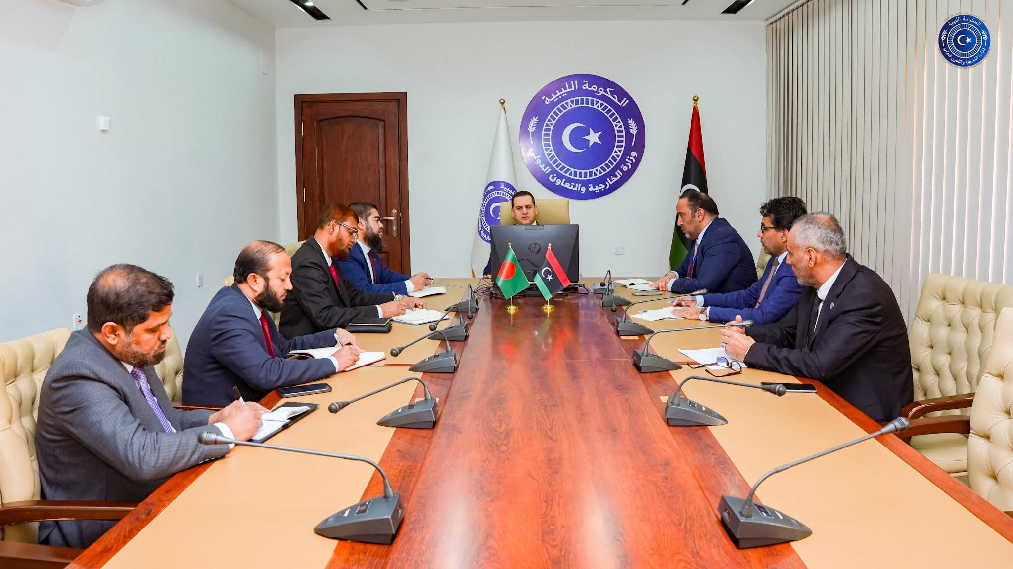استقبل وزير الخارجية والتعاون الدولي بالحكومة الليبية عبدالهادي الحويج سفير جمهورية بنغلاديش الشعبية لدى ليبيا اللواء محمد حبيب الله والوفد المرافق له، في ختام الزيارة الرسمية التي قام بها إلى مدينة بنغازي خلال الفترة من 24 إلى 28 فبراير 2026، بحضور عدد من مديري الإدارات المختصة بالوزارة، حيث جرى استعراض حصيلة الزيارة وما أسفرت عنه من نتائج على صعيد العلاقات الثنائية