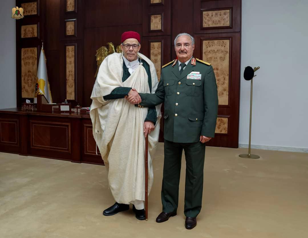 استقبل القائد العام للقوات المسلحة المشير خليفة حفتر، شيخ قبيلة المغاربة، الباشا بالحسن سالم الاطيوش، في مكتبه بمقر القيادة العامة ببنغازي
