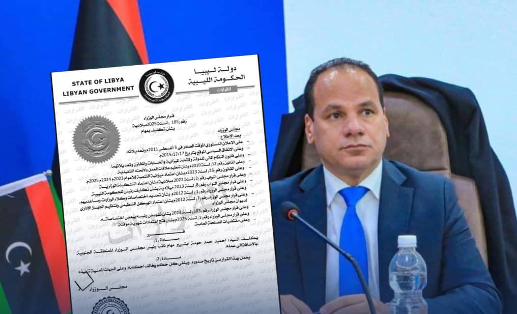 أصدر مجلس وزراء الحكومة الليبية برئاسة الدكتور أسامة حماد القرار رقم (185) لسنة 2025 ميلادية، والذي يقضي بتكليف وزير الدفاع الدكتور أحميد حومة بمهمة نائب رئيس مجلس الوزراء للمنطقة الجنوبية