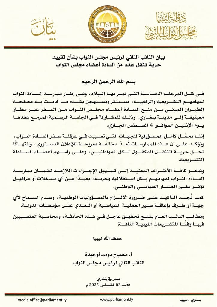 أدان مصباح دومة أوحيدة النائب الثاني لرئيس مجلس النواب، ما وصفه بـ”الإجراءات التعسفية” التي تعرض لها عدد من أعضاء المجلس من قبل مصلحة الطيران المدني في طرابلس، بعد منعهم من السفر عبر مطار معيتيقة إلى مدينة بنغازي للمشاركة في الجلسة الرسمية المزمع عقدها يوم الإثنين وقال في بيان صادر عنه، إن هذه الحادثة تمثل مخالفة صريحة للإعلان الدستوري، وانتهاكاً واضحاً لحرية التنقل المكفولة للمواطنين، وعلى رأسهم أعضاء السلطة التشريعية، محمّلاً الجهات التي تسببت في عرقلة سفر النواب كامل المسؤولية وأكد البيان، ضرورة التزام كافة الأطراف بالمسؤوليات الوطنية، وعدم السماح لأي جهة بالتأثير على مسار العملية السياسية أو التعدي على مؤسسات الدولة، داعياً إلى فتح تحقيق عاجل في الحادثة ومحاسبة المسؤولين عنها وفقاً للتشريعات الليبية