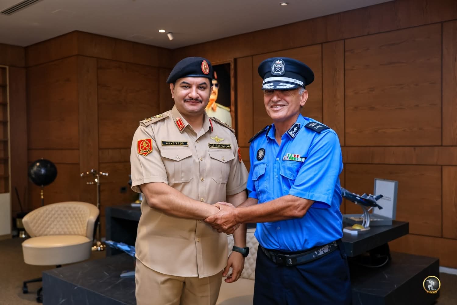 رئيس أركان القوات البرية الفريق ركن "صدام حفتر" يلتقي برئيس جهاز الشرطة القضائية اللواء "مصطفى بوحرارة"، في مكتبه بمقر الرئاسة في بنغازي