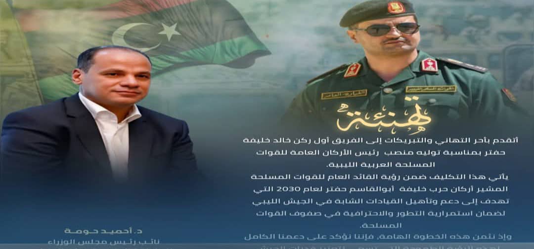 وقال د. حومة، في بيان، إن هذا التعيين يأتي ضِمن رؤية القائد العام المشير خليفة حفتر لعام 2030، والتي تهدف إلى دعم وتأهيل القيادات الشابة، لضمان استمرار التطور والاحترافية في صفوف القوات المسلحة