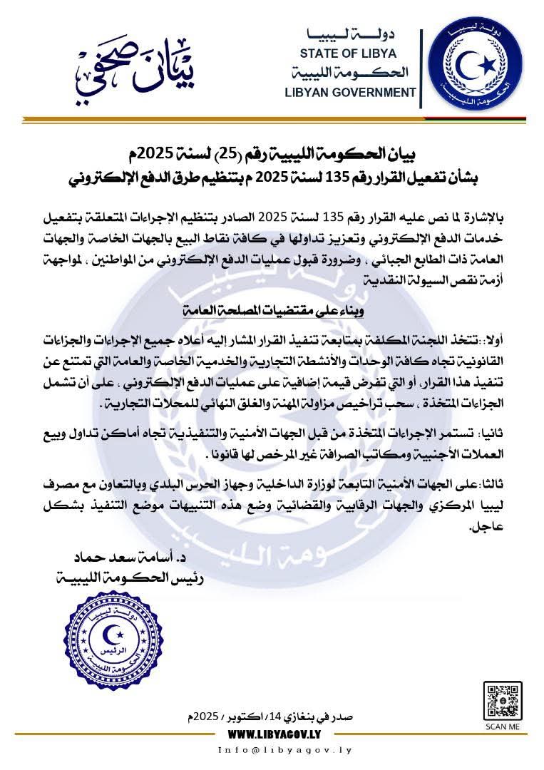 أصدرت الحكومة الليبية، البيان رقم (25) لسنة 2025م بشأن تفعيل القرار رقم 135 لسنة 2025 م، والمتعلق بتنظيم طُرق الدفع الإلكتروني في المعاملات التجارية والخدمية بالقطاعين العام والخاص، في إطار مواجهة أزمة السيولة النقدية وتعزيز التحول الرقمي في البلاد