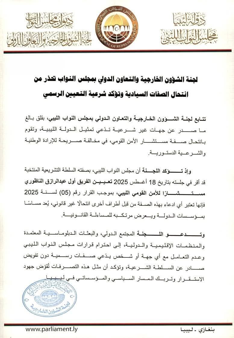 حذرت لجنة الشؤون الخارجية والتعاون الدولي بمجلس النواب من محاولات “انتحال صفات سيادية” من قبل جهات غير شرعية تدعي تمثيل الدولة الليبية دون تفويض رسمي، معتبرة أن ذلك يمثل مساسًا بمؤسسات الدولة ويعرض مرتكبيه للمساءلة القانونية