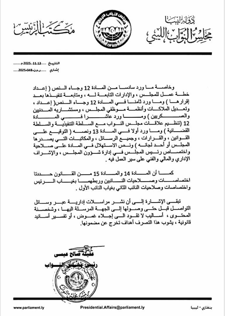 فخامة رئيس مجلس النواب المستشار عقيلة صالح يؤكد التزام مجلس النواب بمبدأ التشاور والشفافية في إدارة شؤونه التشريعية