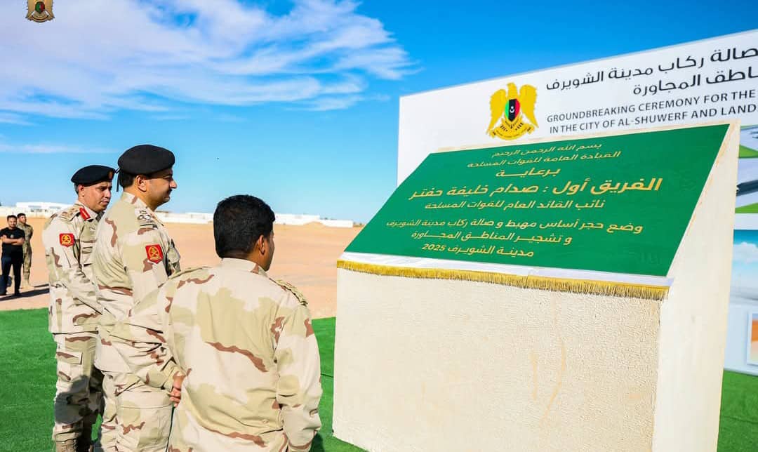 الفريق أول ركن "صدام حفتر"، نائب القائد العام للقوات المسلحة، يضع حجر الأساس لمشروع إنشاء مطار الشويرف الدولي، الذي يُقام على مساحة تقدّر بـ2000 هكتار، ويضم مهبطًا بطول 3 كيلو متر و600 متر، وثلاثة مداخل للطيران وساحتين لحركة الطائرات، كما يضم مبنى للركاب، ومستودعات للشحن الجوي، وكافة المرافق الخدمية والتجارية وشهدت المراحل الأولى للمشروع إنجاز أعمال البنية التحتية الأساسية، والبدء في تنفيذ طبقات الخرسانة المسلحة النهائية، ويأتي تصميم وتنفيذ المشروع بالامتثال للمعايير الدولية، مع مراعاة سلامة العمليات الجوية من خلال تجهيز الإضاءة والملاحة المعتمدة وأنظمة الطاقة الاحتياطية، وتوفير وسائل الملاحة البصرية والإلكترونية، والالتزام بلوائح الطيران المدني