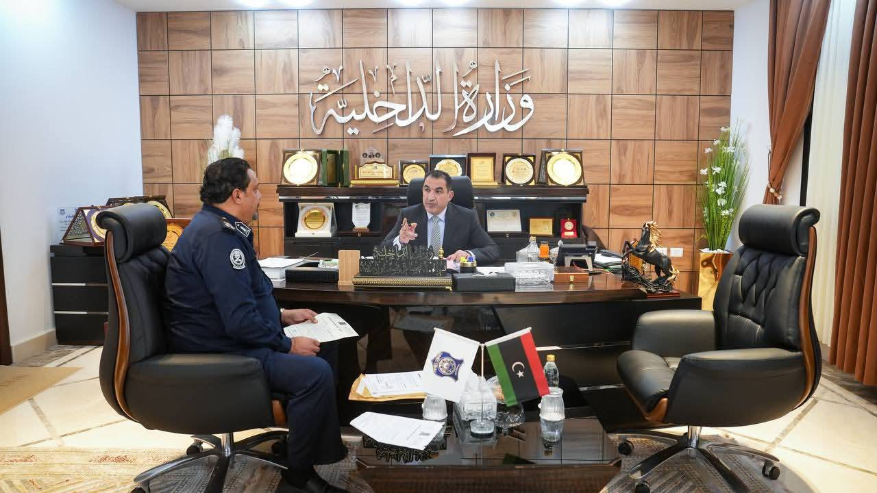اجتمع وزير الداخلية، اللواء عصام أبوزريبة، مع اللواء "صلاح الخفيفي"، رئيس جهاز مكافحة الهجرة غير الشرعية، في مكتبه بديوان الوزارة بمدينة بنغازي وخلال الاجتماع، قدّم رئيس الجهاز إحصائية شاملة عن المهام التي قام بها الجهاز في جميع فروعه خلال الفترة الماضية، بما في ذلك عمليات ترحيل المهاجرين المحالين للجهاز والمضبوطين من جنسيات مختلفة مثل السودانية والبنغلاديشية والتشادية وغيرها، وتنظيم ترحيلهم وفق الضوابط القانونية والإنسانية بالتنسيق مع سفاراتهم، وحل الإجراءات المتعثرة بما يضمن احترام حقوقهم كما استعرض الاجتماع جهود الجهاز في ضبط شبكات التهريب والاتجار بالبشر، والمخالفين للقوانين، إضافة إلى عمليات تحرير المهاجرين في مناطق شرق وجنوب البلاد، وتعزيز الإجراءات الوقائية لمنع تسلل المهاجرين بطريقة غير قانونية